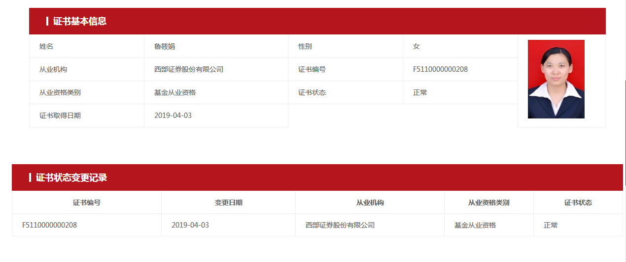 | 鲁筱娟 | F5110000000208 | 西安沣惠南路营业部 | 基金从业资格 | 查看详情 |