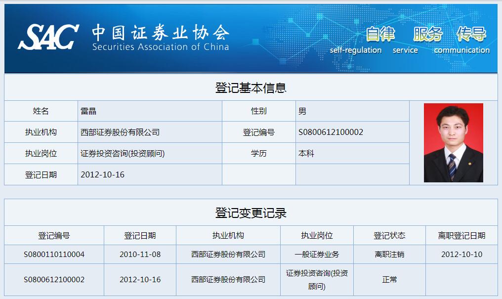 | 雷晶 | S0800612100002 | 宝鸡新华路营业部 | 证券投资咨询业务(投资顾问) | 查看详情 |