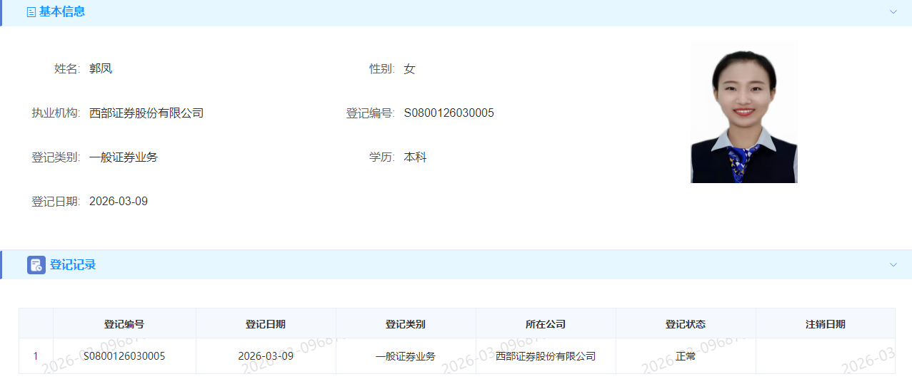 | 彭妮子 | S0800126030004 | 上海梅川路营业部 | 一般证券业务 | 查看详情 |