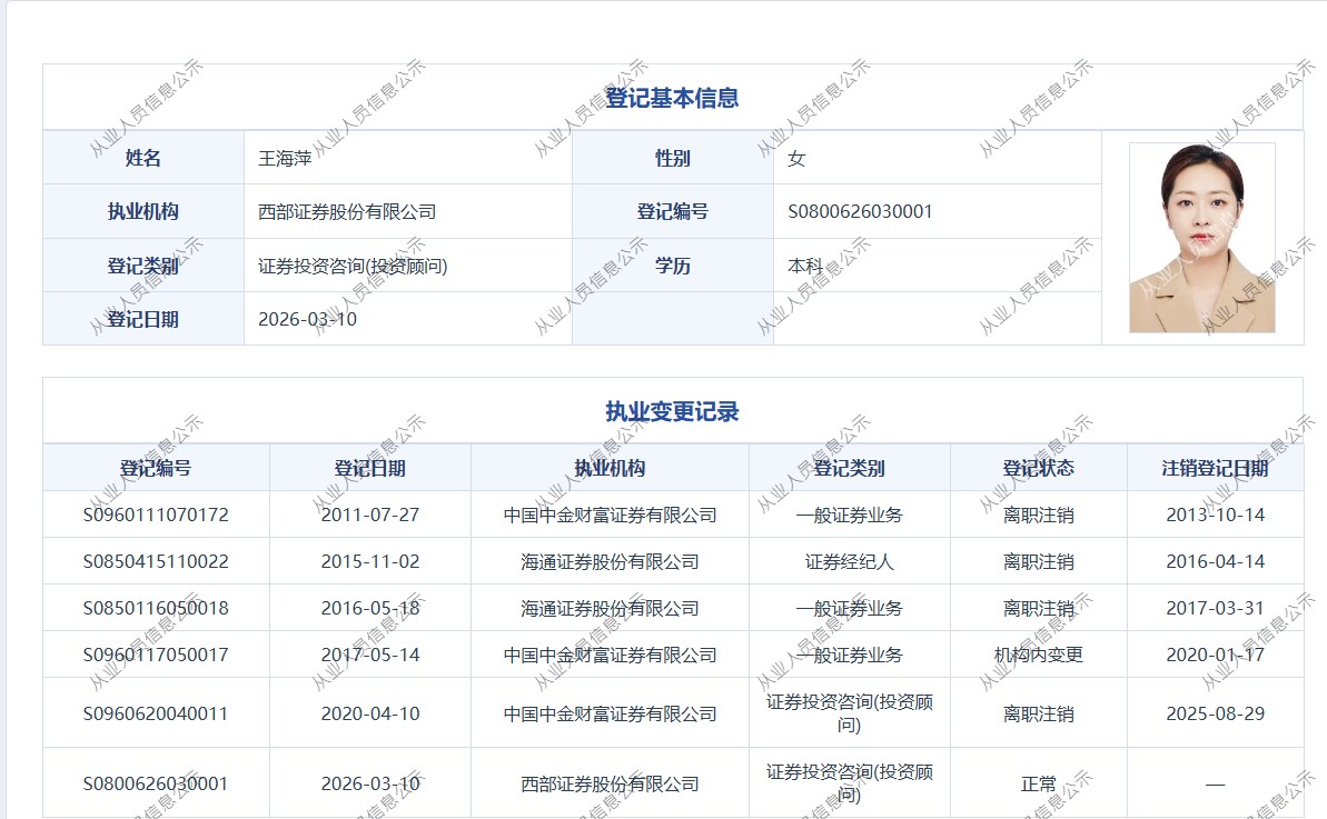 | 王海萍 | S0800626030001 | 西安欧亚大道营业部 | 证券投资咨询业务(投资顾问) | 查看详情 |