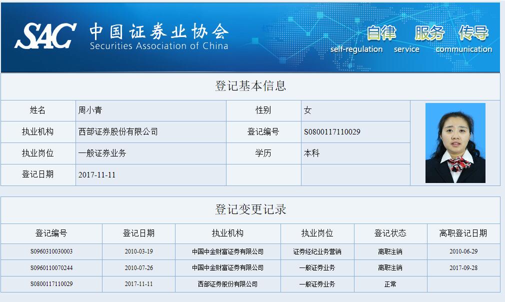 | 周小青 | S0800117110029 | 山东分公司 | 一般证券业务 | 查看详情 |