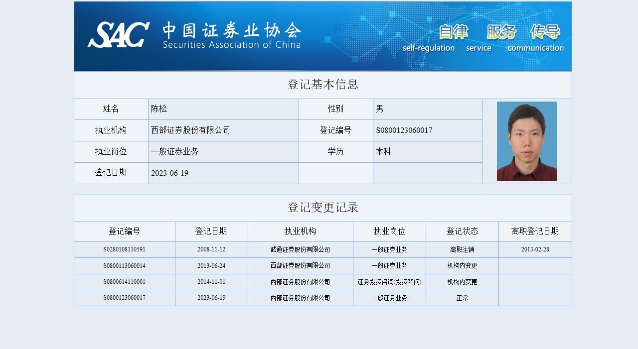 | 陈松 | S0800123060017 | 北京学院南路营业部 | 一般证券业务 | 查看详情 |