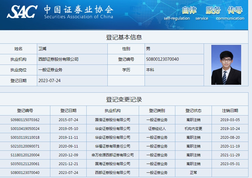 | 卫禹 | S0800123070040 | 乌鲁木齐红山路营业部 | 一般证券业务 | 查看详情 |