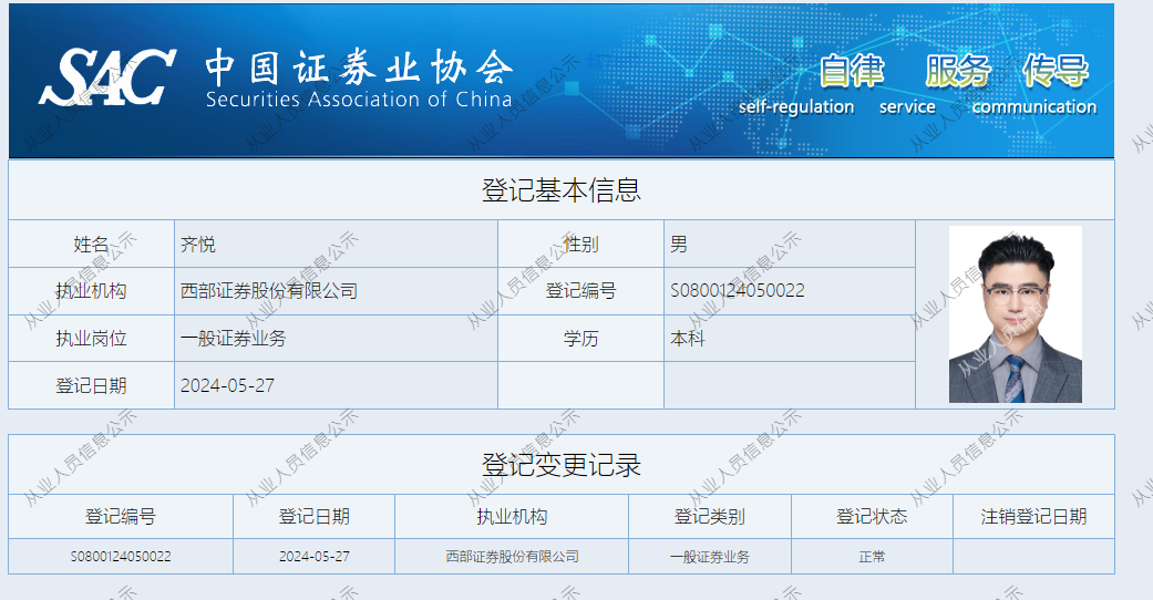 | 齐悦 | S0800124050022 | 西安高新区营业部 | 一般证券业务 | 查看详情 |