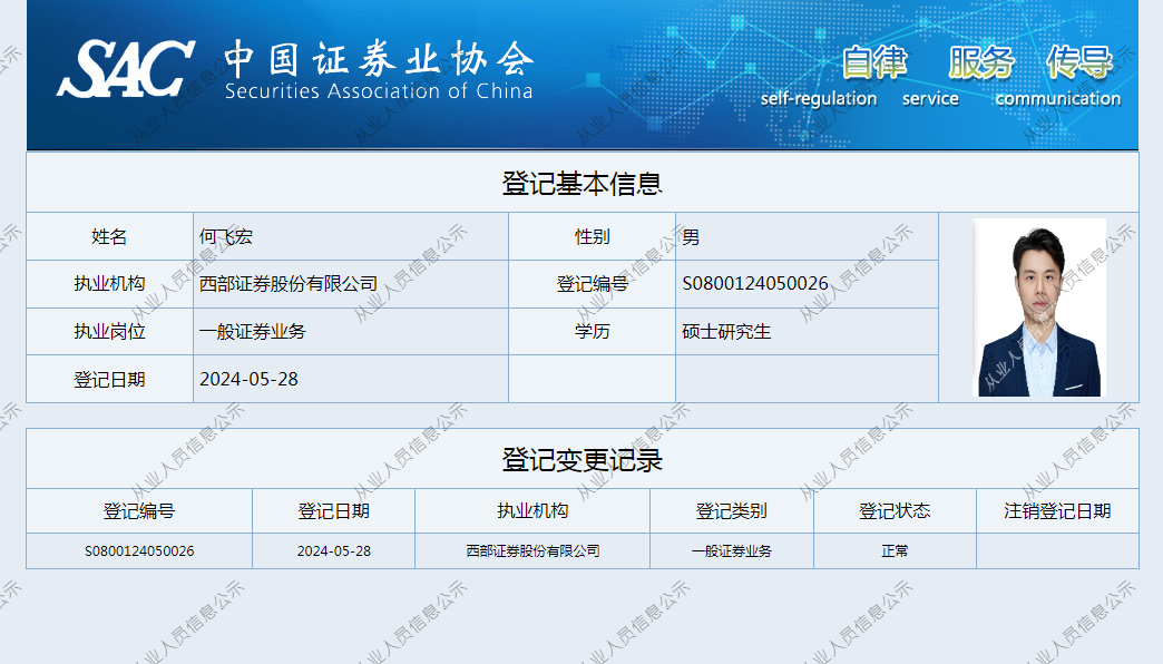 | 何飞宏 | S0800124050026 | 北京分公司 | 一般证券业务 | 查看详情 |