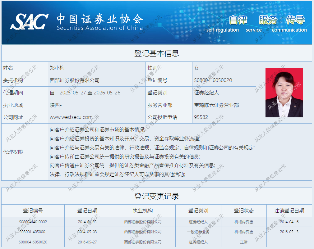 | 郑小梅 | S0800416050020 | 宝鸡陈仓营业部 | 证券经纪人 | 查看详情 |