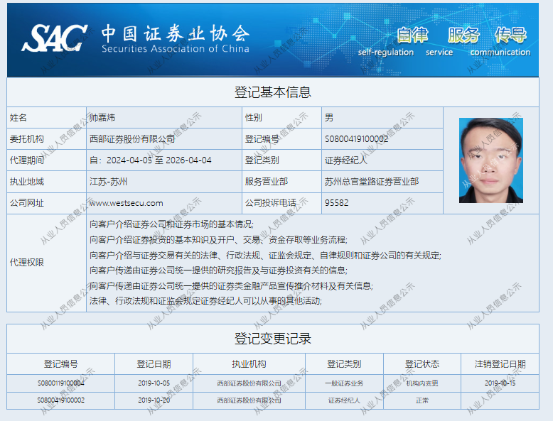 | 帅嘉炜 | S0800419100002 | 苏州总官堂路营业部 | 证券经纪人 | 查看详情 |