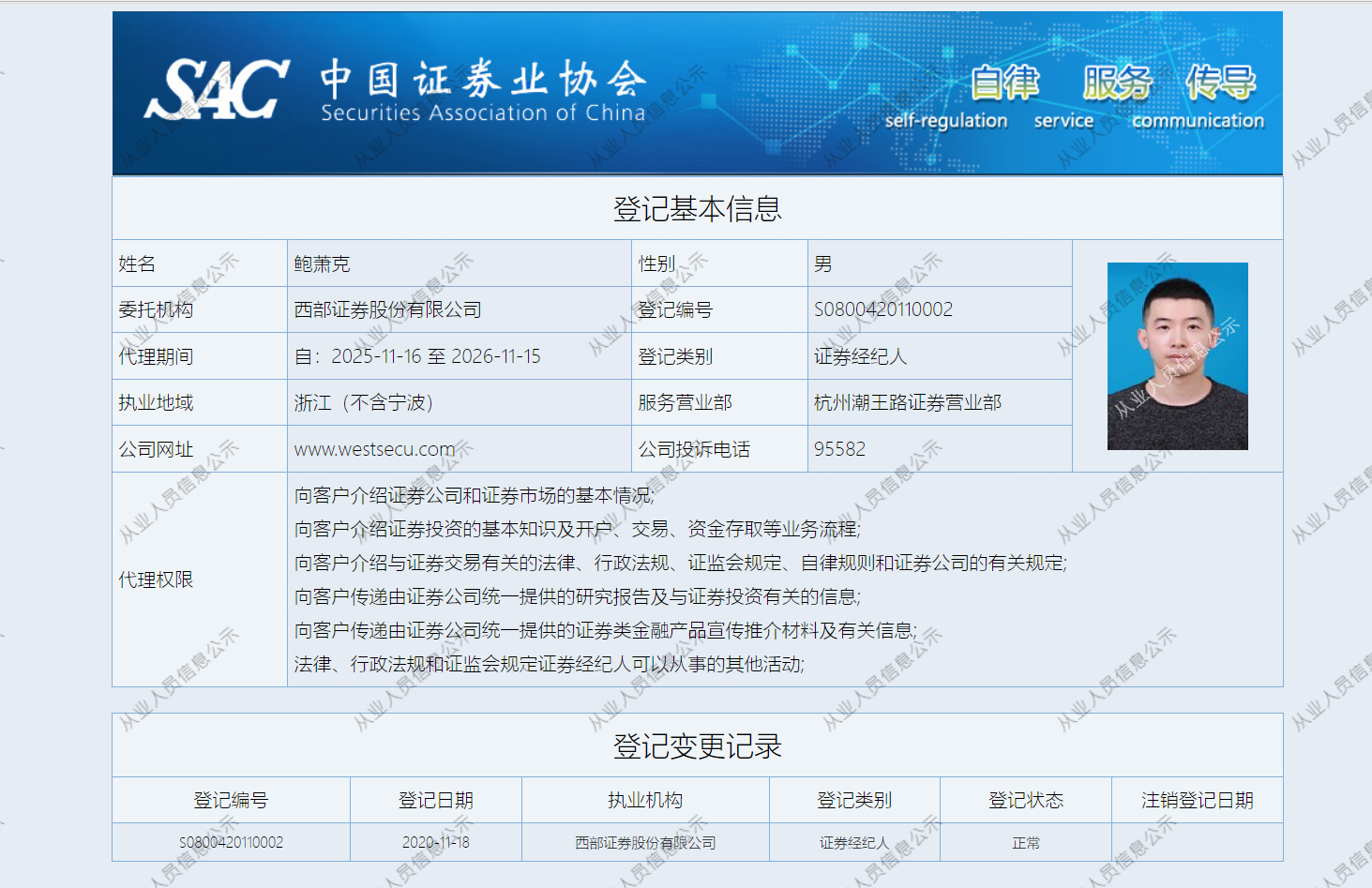 | 鲍萧克 | S0800420110002 | 杭州潮王路营业部 | 证券经纪人 | 查看详情 |