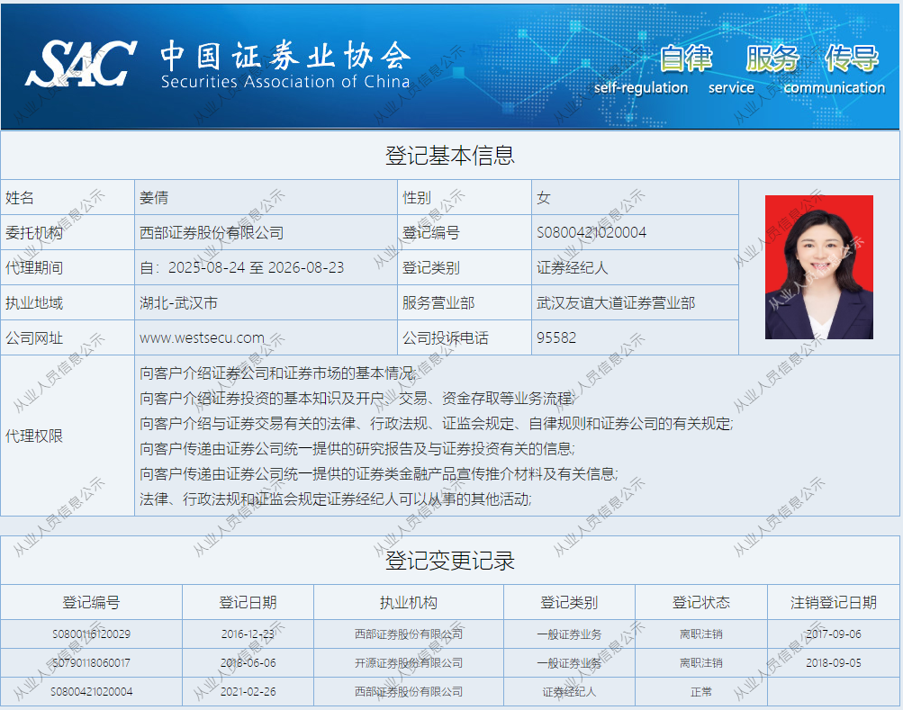 | 姜倩 | S0800421020004 | 武汉友谊大道营业部 | 证券经纪人 | 查看详情 |