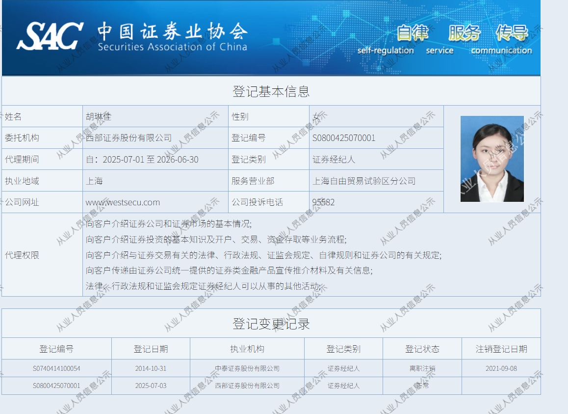 | 胡琳佳 | S0800425070001 | 上海自由贸易试验区分公司 | 证券经纪人 | 查看详情 |